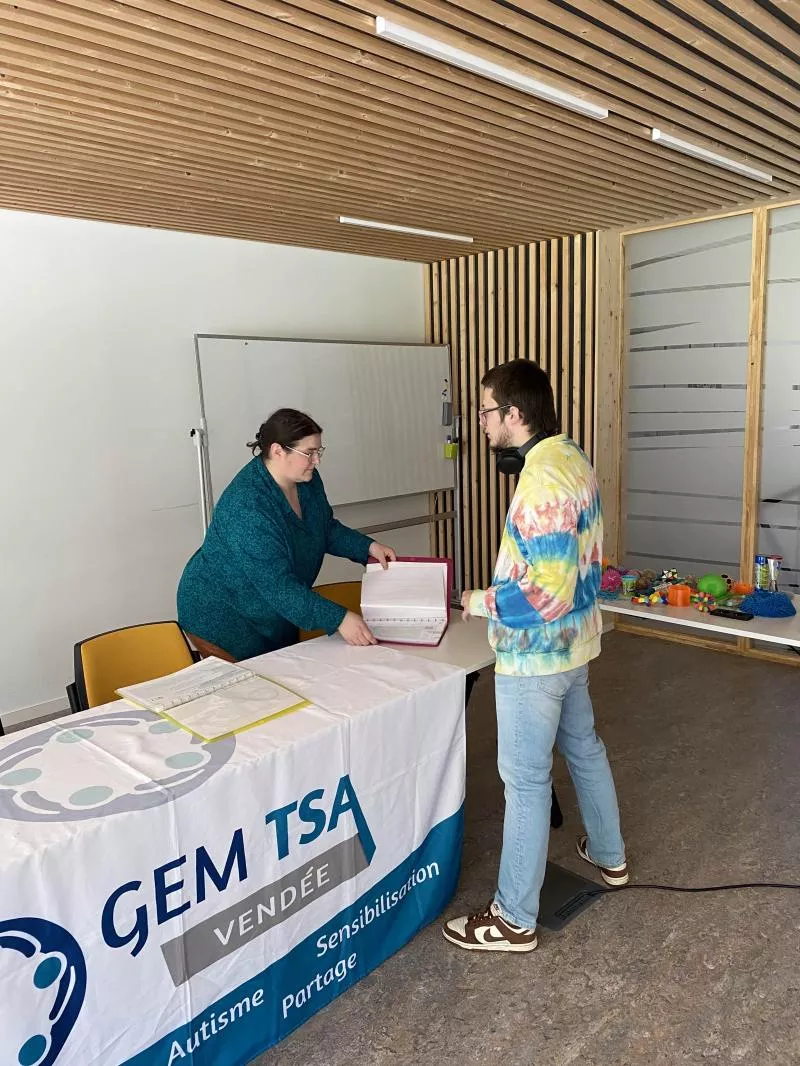 Floris et Jonathan (adhérents), Élodie P. (Présidente) et Céline Agin (Coordinatrice) ont pu aller présenter le GEM TSA Vendée et sensibiliser au spectre autistique des professionnels de l'AREAMS.